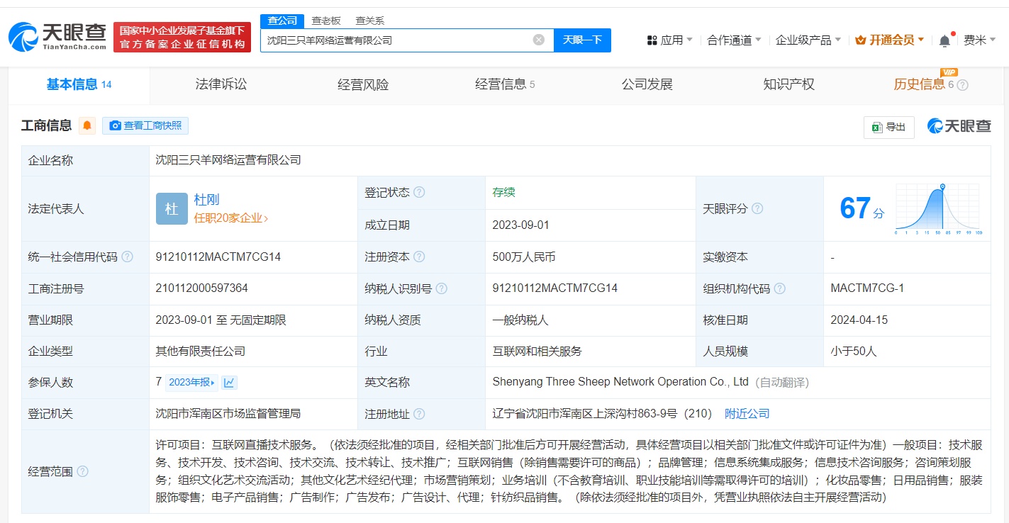 Tianyancha App shows that Shenyang Sanzhiyang Network Operation Co., Ltd. was established in September 2023, with Du Gang as the legal representative and a registered capital of 5 million RMB. Its business scope includes internet live streaming technical services, brand management, and marketing planning. Shareholder information indicates that the company is jointly owned by Hefei Sanzhiyang Commercial Operation Management Co., Ltd., Shenyang Xiaodian Culture Media Co., Ltd., and Anhui Runfuyuan Information Technology Co., Ltd. Change records show that in April of this year, Li Dongsheng (Li Paoer) stepped down as the company's legal representative, executive director, and manager, with Du Gang taking over all these roles. Annual report information reveals that the company had 7 employees enrolled in social insurance in 2023.