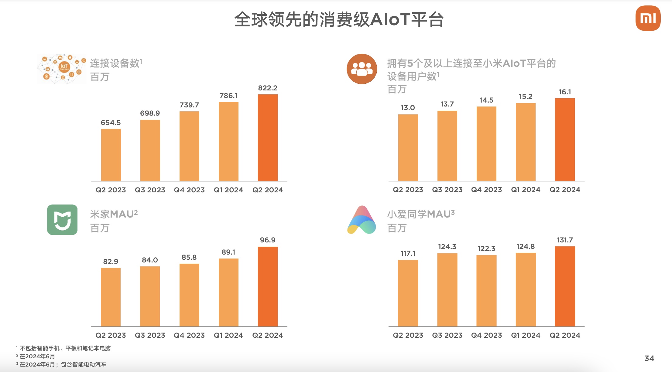 In terms of IoT business, Xiaomi Group's IoT connected devices reached 822 million units in 2024Q2, a year-on-year increase of 25.6%, with over 16.1 million users owning five or more devices, a year-on-year increase of 24.2%. Major appliances grew by 38.7% year-on-year, with air conditioner shipments exceeding 3.3 million units, a year-on-year increase of 40%; refrigerator shipments reached 600,000 units, a year-on-year increase of 25%; washing machine shipments reached 400,000 units, a year-on-year increase of 30%; global tablet shipments grew by 106% year-on-year.