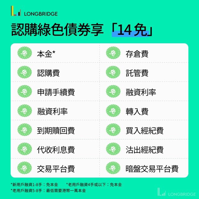 對我來講投資綠色債劵的策略是需要選擇一間比較適合自己而又最多優惠的公司。長橋證劵果然是做得到最多免的劵商。銀行提供的括免優惠始終不及這長橋劵商為多的,手續費用仍給長橋劵商為高。