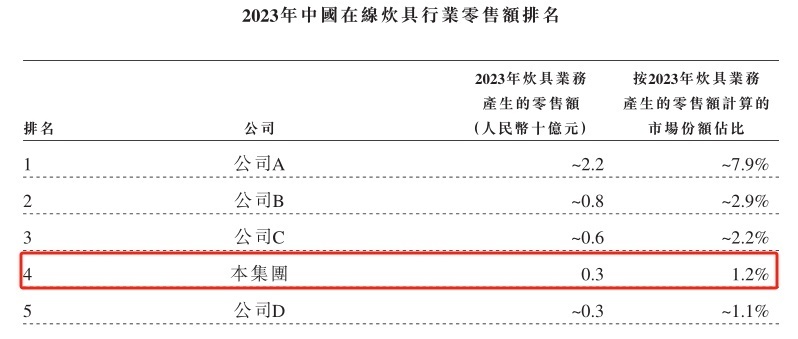 The online cookware market where the group operates is highly fragmented, with no dominant player. According to CIC data, the top five cookware brands in China accounted for less than 15.2% of the online retail market in 2023. The company ranked fourth in the Chinese market with a market share of about 1.2%.