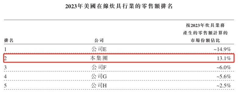 According to CIC data, the top five cookware brands in the U.S. accounted for about 42.1% of the online retail market in 2023. The company ranked second in the U.S. market with a market share of about 13.1%.