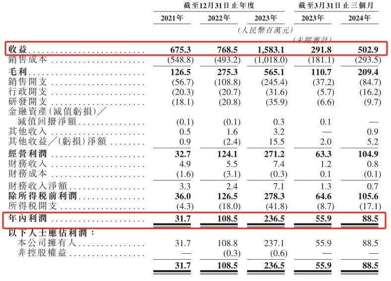 The company's revenue from 2021 to 2023 was HKD 675 million, HKD 768 million, and HKD 1.583 billion, respectively, with a 106% year-on-year growth in 2023. Net profit for 2021–2023 was HKD 31.655 million, HKD 108 million, and HKD 236 million, respectively, with a 117.97% year-on-year growth in 2023. The company's performance is excellent, with rapid growth.