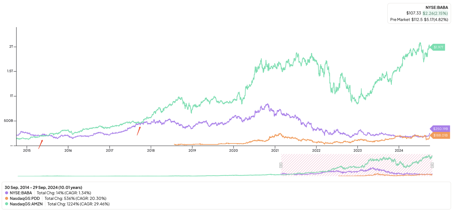Comparison of market capitalization between $Amazon(AMZN.US), $Alibaba(BABA.US), and $PDD(PDD.US) over the past decade