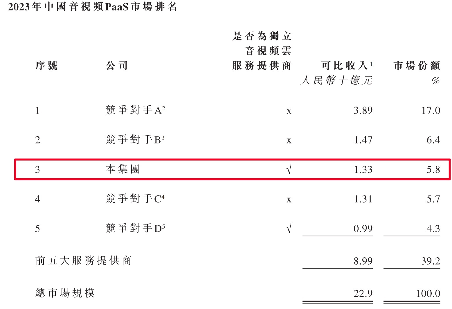 (1) In 2023, the top five service providers in China's audio-video PaaS market accounted for 39.2% of the market share. Qiniu Intelligence ranked third with revenue of RMB 1.33 billion, holding a 5.8% market share.