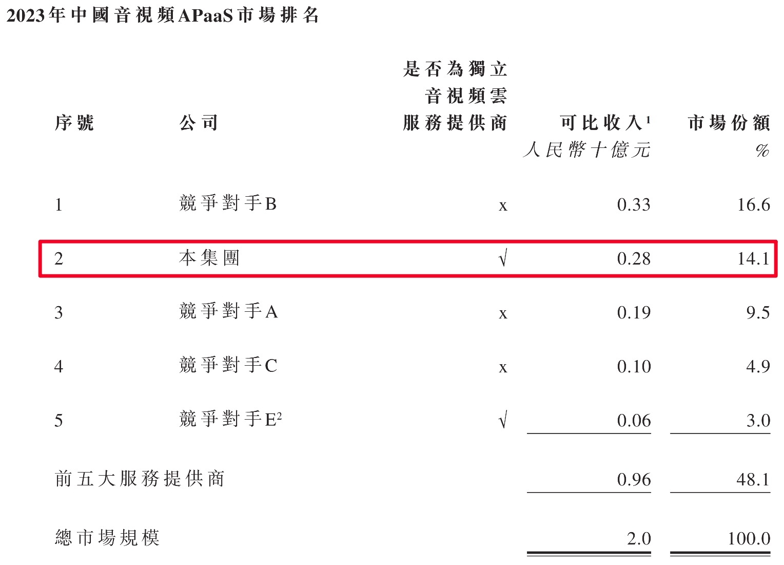 (2) In 2023, the top five service providers in China's audio-video APaaS market accounted for 48.1% of the market share. Qiniu Intelligence ranked second with APaaS revenue of RMB 280 million, holding a 14.1% market share.