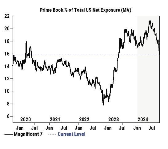 The chart shows the "Prime Book % of Total US Net Exposure (MV)" (Prime Book percentage of total US net exposure), which primarily focuses on a group of stocks known as the "Magnificent 7". The timeline spans from 2020 to mid-2024, illustrating the trend of these stocks or assets in the total US market net exposure.