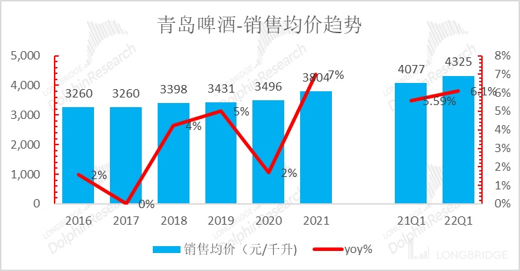 整体来看,2022 年第一季度青岛啤酒的销售均价同比改善幅度大于同比销量下滑程度,销量增速触顶回落,是导致青岛啤酒第一季度营收仅实现小幅增长的主要原因。