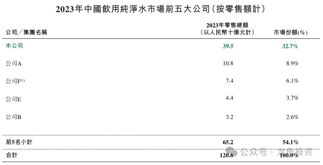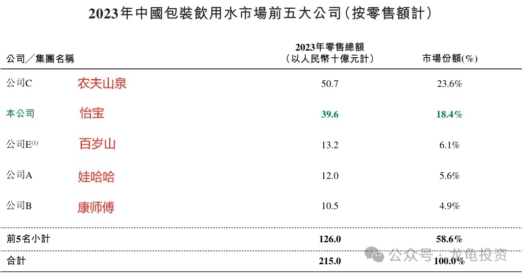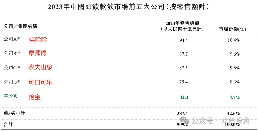 According to the prospectus, the top five companies in China's ready-to-drink soft beverage market in 2023 were: 1. Wahaha, 2. Master Kong, 3. Nongfu Spring, 4. Coca-Cola, and 5. C'estbon. In the packaged water market, the rankings were: 1. Nongfu Spring, 2. C'estbon, 3. Ganten, 4. Wahaha, and 5. Master Kong.
