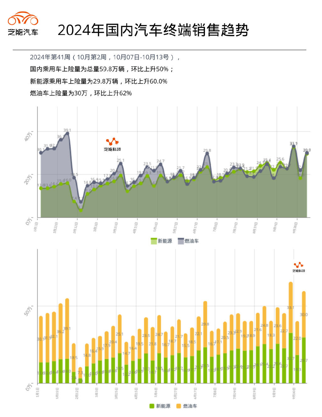 2024 年第 41 周(10 月第 2 周,10 月 07 日-10 月 13 号),国内乘用车上险量为总量 59.8 万辆,环比上升 50%;