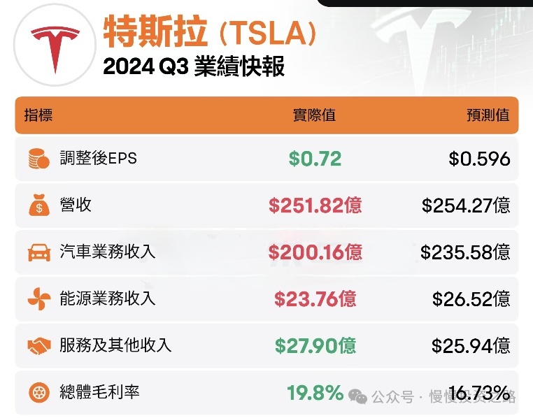 After the U.S. stock market closed yesterday, $Tesla(TSLA.US) released its Q3 2024 earnings report. The profit side exceeded market expectations, while the revenue side actually fell short of expectations. Since the delivery data was already known, the revenue gap wasn’t significant. The gross margin improved sharply to 19.8%, and net profit grew by 8%.