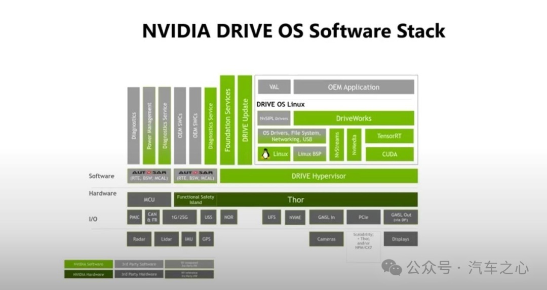 从针对 Drive Thor 打造的软件堆栈示意图上,可以看到从底层传感器设备开始,到硬件系统,以及软件系统,形成了一套紧密耦合的开发架构。