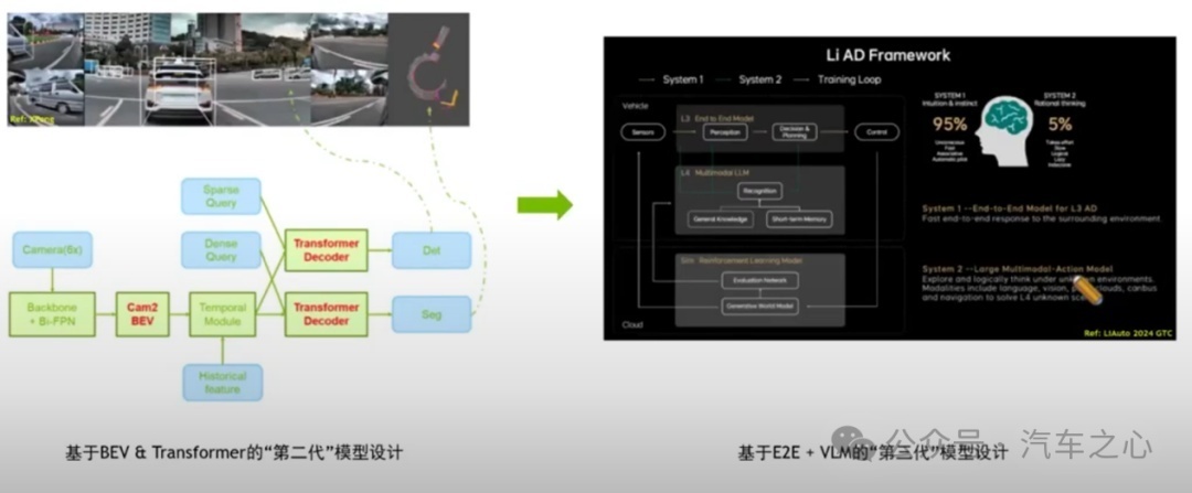比如理想发布「端到端+VLM」的全新模型架构,打出快慢系统的组合拳,能让 AI 做出拟人化的驾驶行为。