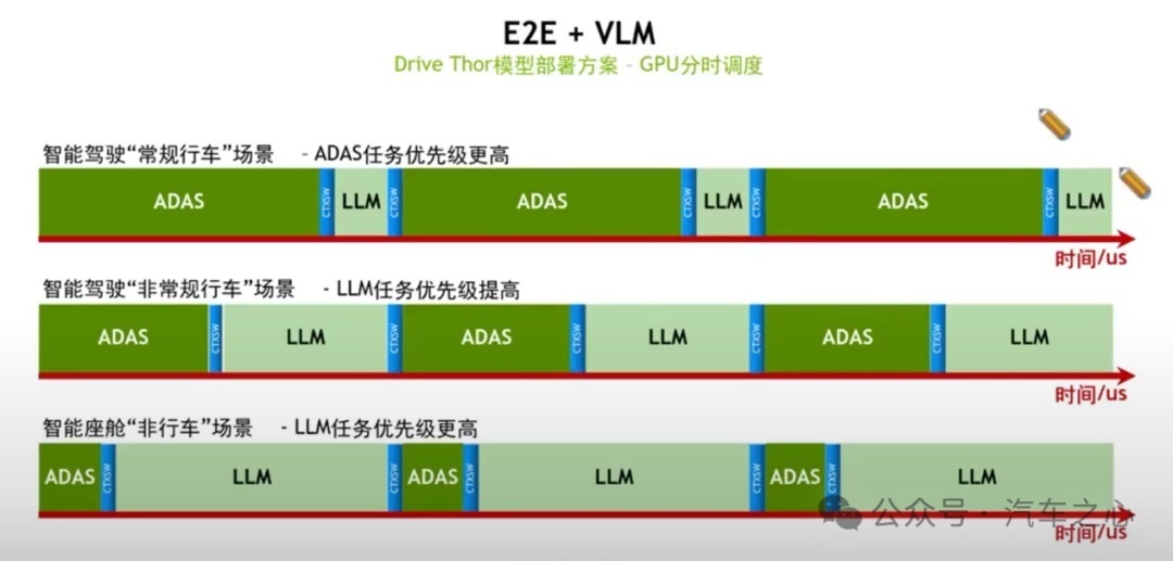 在执行端到端任务时,优先级往往更高,对于算力调度需要及时,而在处理低速一些极端场景时,优先级更低。同样,在进行一些座舱交互、娱乐功能时,就可以把自动驾驶占用的 GPU 让出来。