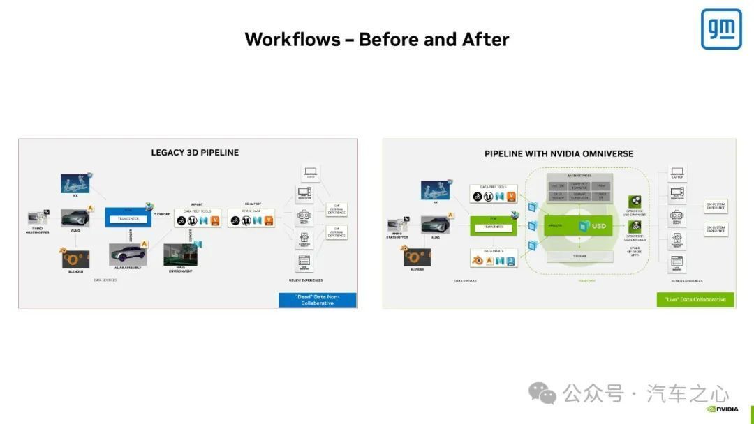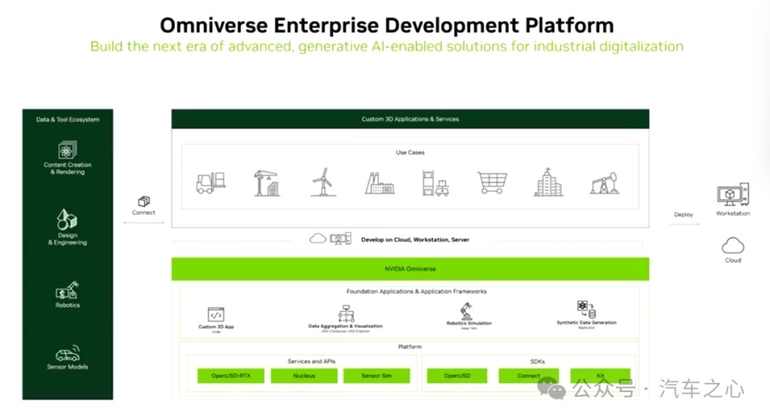 在通用汽车案例中,就通过 Omniverse 平台构建了统一的数据工作流程,开发者可以在原有熟悉的软件中进行设计作业,并且通过 OpenUSD 与 Omniverse 平台完成实时协作,进而减少数据传导时间,简化工作流程。