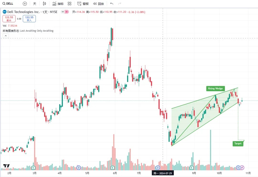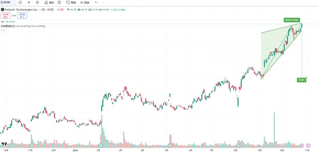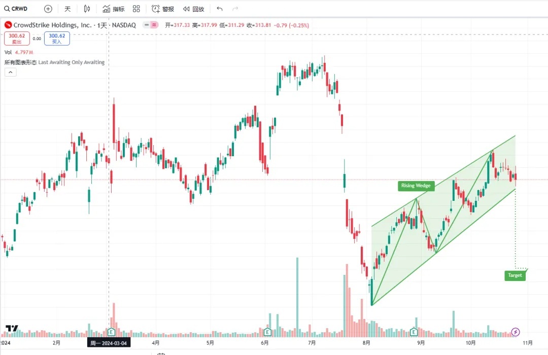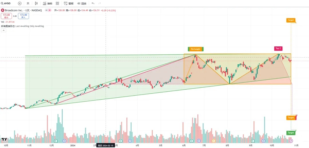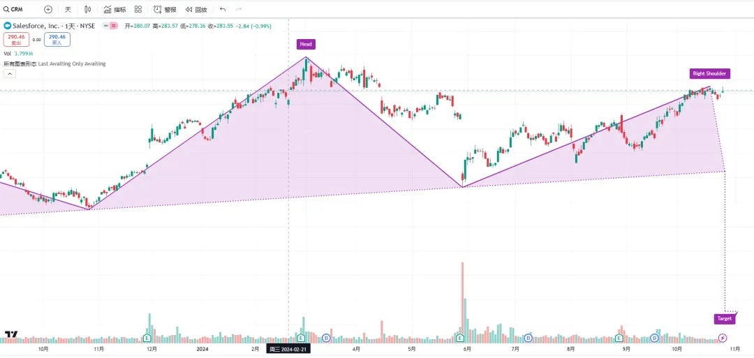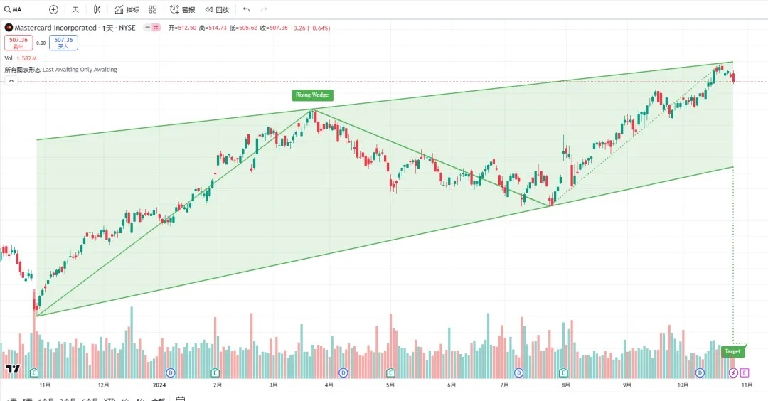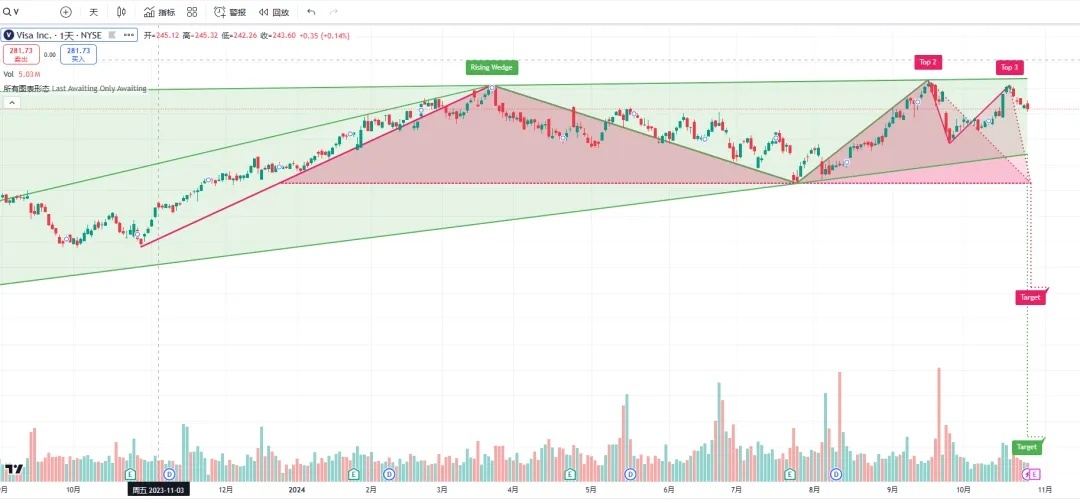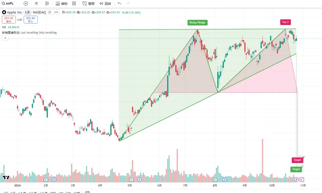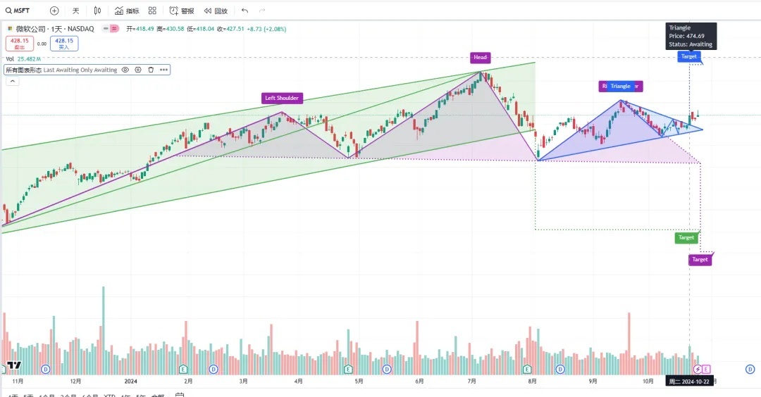 微软正在形成头肩顶形态,上升楔形形态目标价是 321.73,三角形突破了,目标价 474