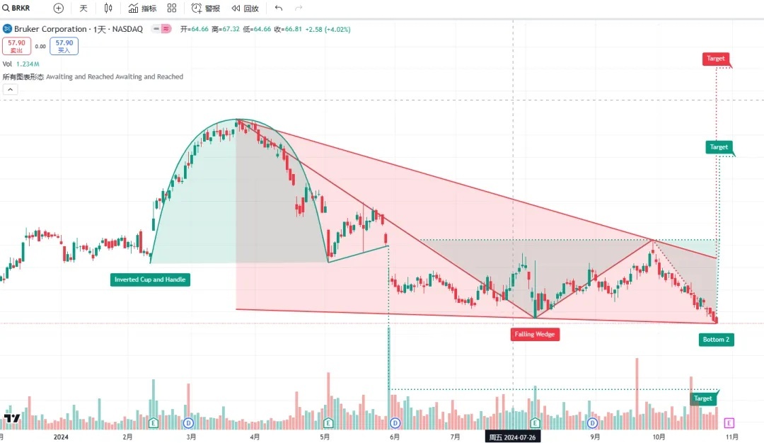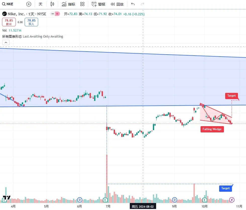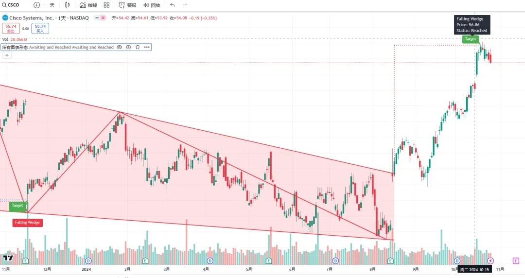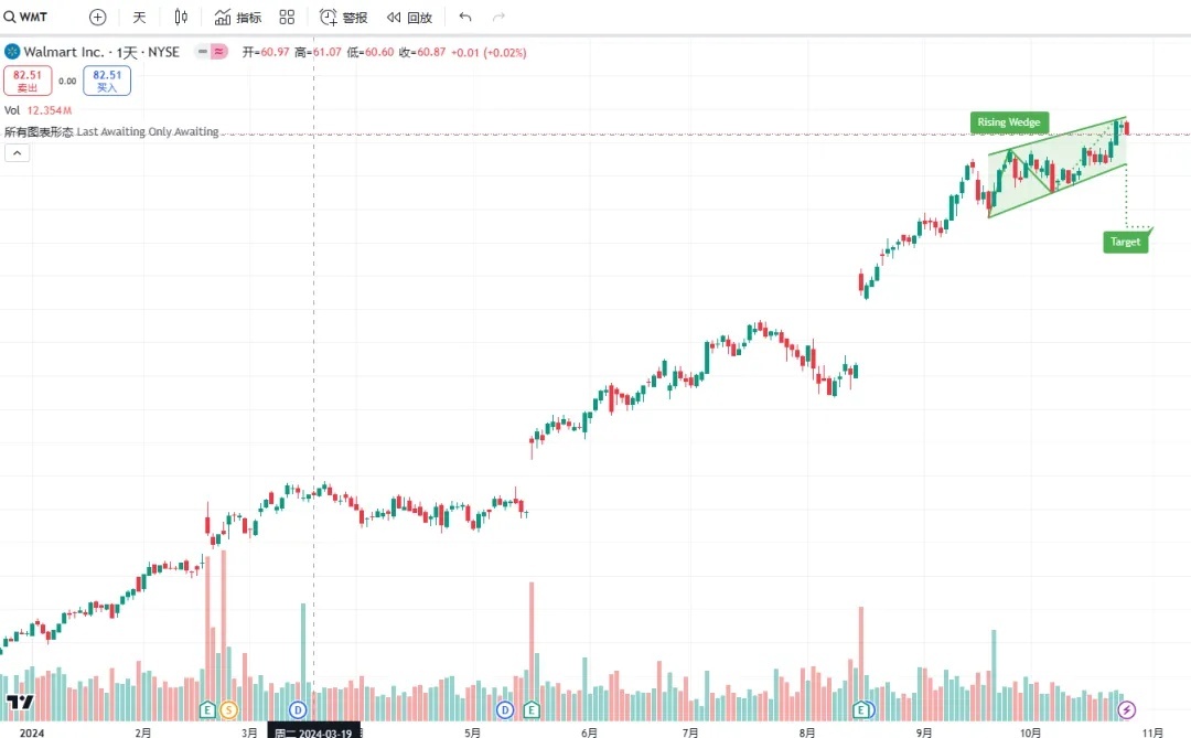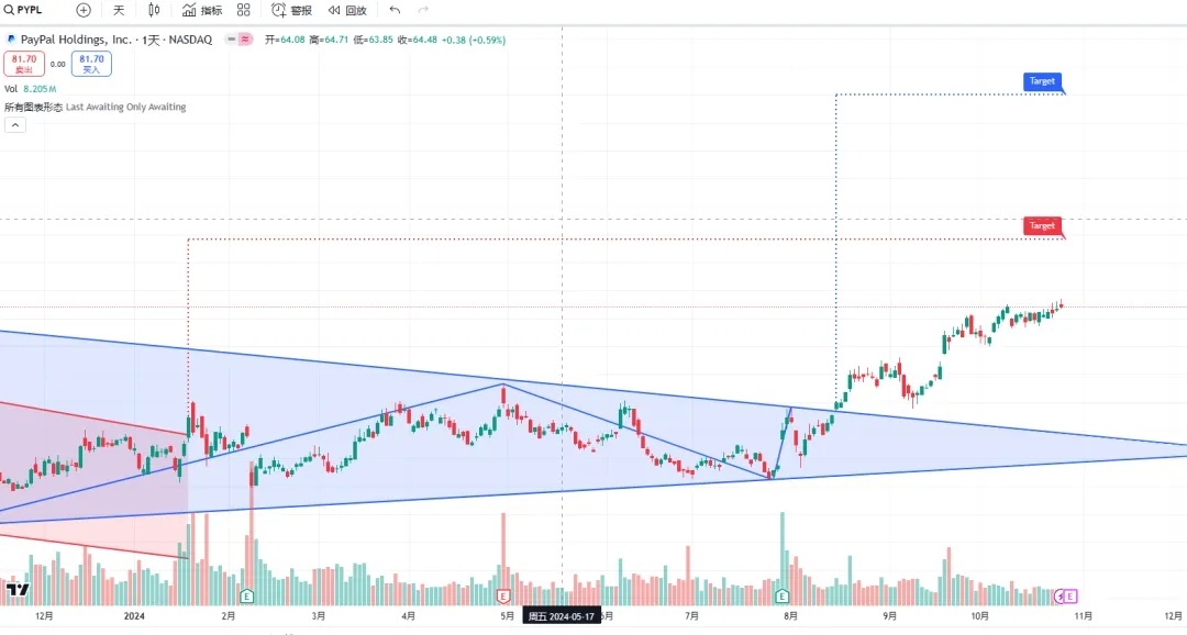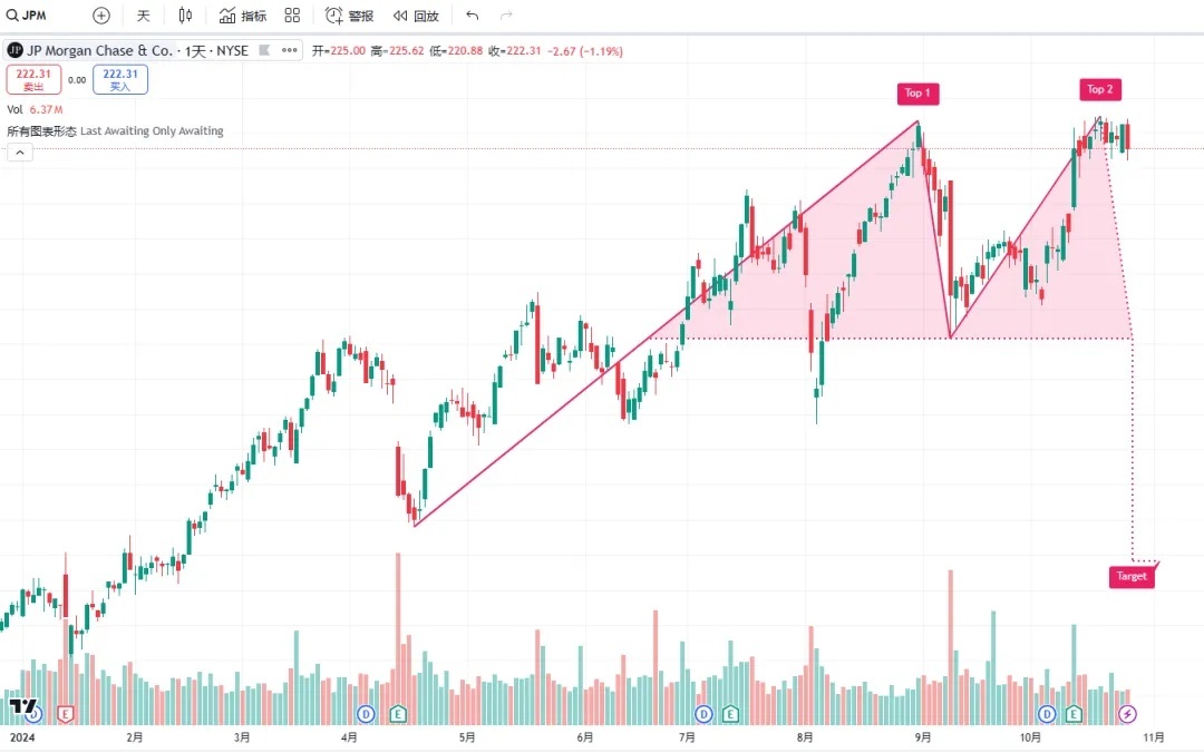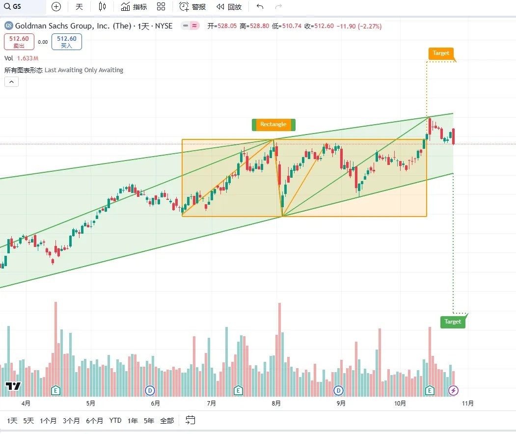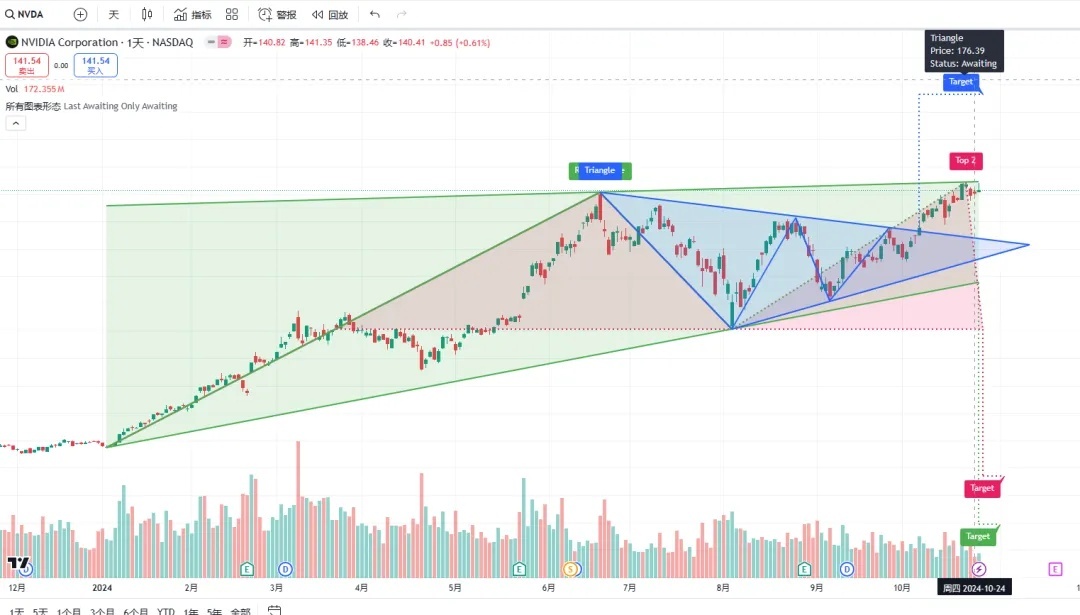 微软正在形成头肩顶形态,上升楔形形态目标价是 321.73,三角形突破了,目标价 474
