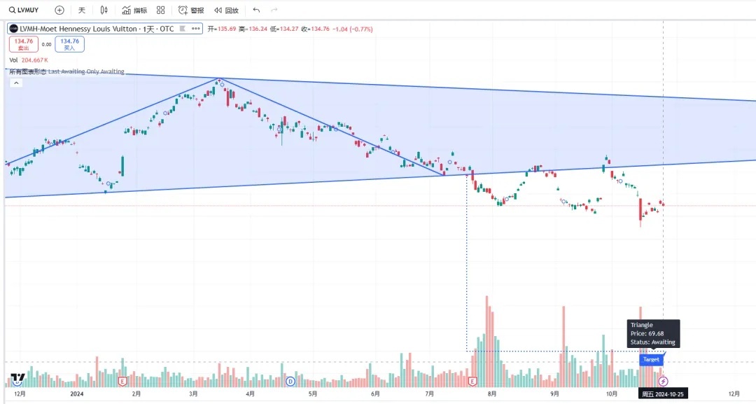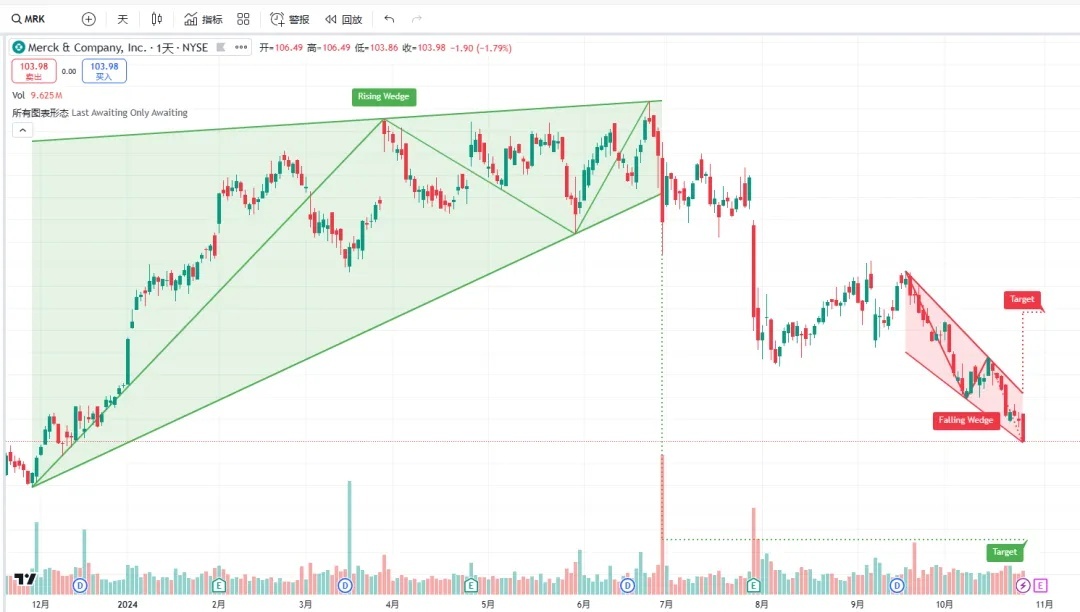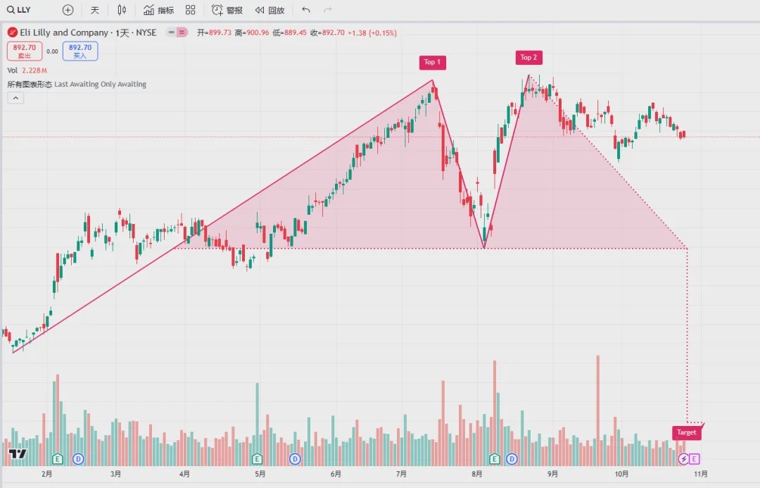 诺和诺德,刚走完一个 RW 和一个三角形,头肩顶,第一目标价 102.39,比上周多了 FW 和正在形成的双底