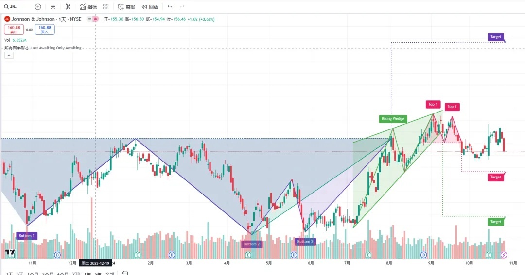 强生刚形成了一个三重底形态,走了一个 RW,跟一个双顶形态,双顶的目标价是 156,RW 是 147,三重底是 184