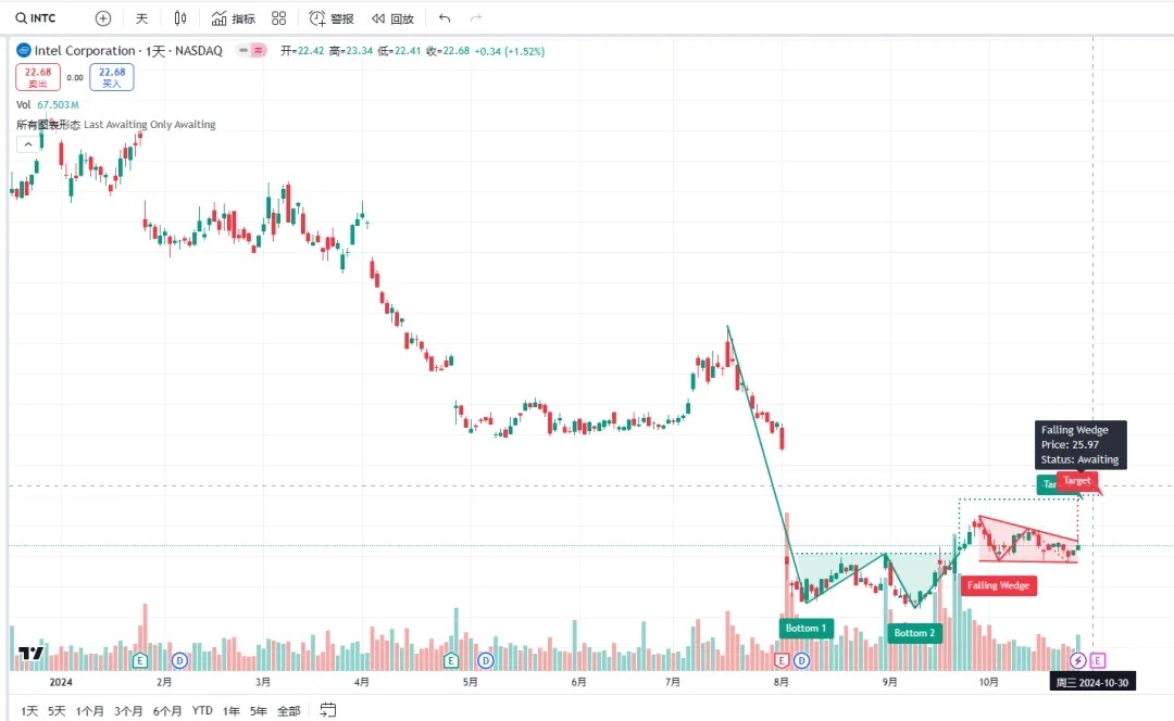 英特尔这里有一个小双底,目标价是 25.73,正在一个 RW 中