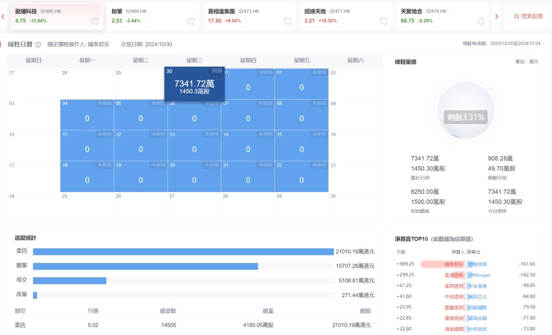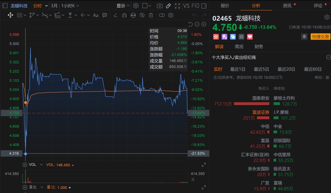 Fortunately, when it dropped to 20%, Guotai Junan, acting as the stabilizing agent (green shoe), stepped in. The rebound from -20% to just -2% was entirely driven by Guotai Junan’s green shoe buying. Guotai Junan’s green shoe is quite reliable—remember the UBTECH project where their green shoe also did a great job stabilizing the price. Today, they did their best to support this stock, but even after exhausting all their green shoe ammunition, they couldn’t stop the international placement from selling off.