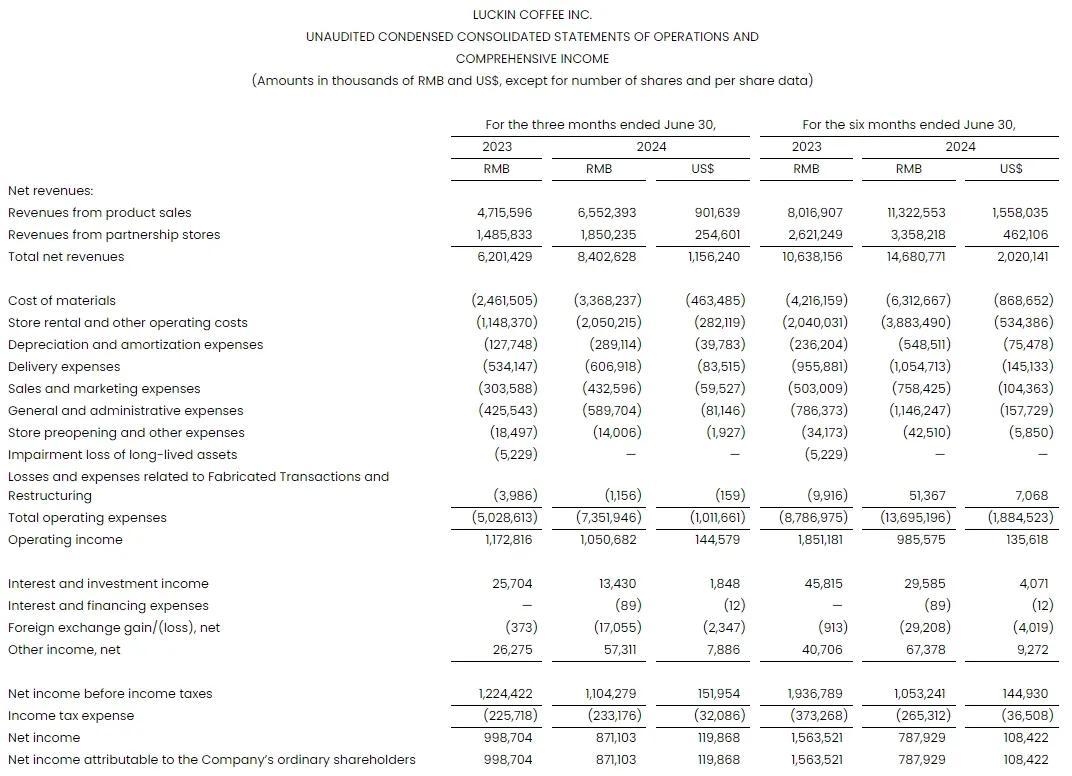 Luckin's financials show H1 revenue up 38% YoY, but net profit fell nearly 50%. Q2 revenue rose 35.5%, but net profit dropped 12.8%. The company blamed lower average selling prices and market volatility.
