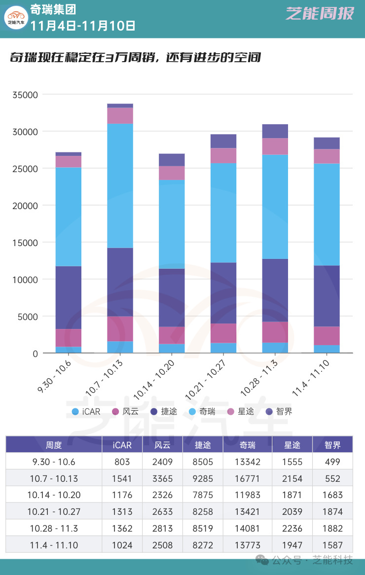 奇瑞集团旗下多个品牌(奇瑞、捷途、星途、智界、iCAR 和风云)在近几周的销量表现: