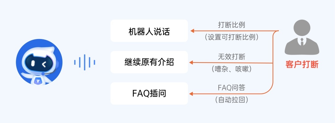With this technology, the robot can be interrupted based on customer speech or ignore background noise. When customers mention new FAQ keywords, it automatically initiates a new dialogue.