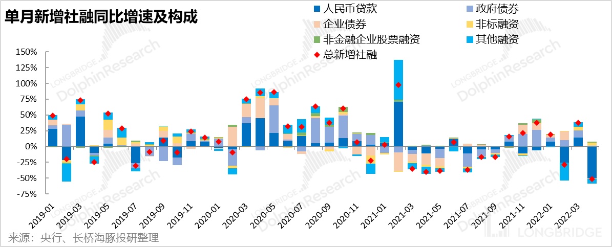 4 月社融增速同比下滑了 51%,其中人民币贷款贡献了接近 50 个点,同比正增长只有政府债券、股票融资和非标融资,其中新增非标融资的正增长主要是因为缩杠杆的力度有所减弱(新增非标贷款依然是负数)。
