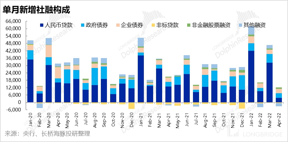 原本社融的主要构成是人民币贷款、政府债券、企业债券、非标融资,股票融资、其他还有如外币、银行发的 ABS、汇票等。