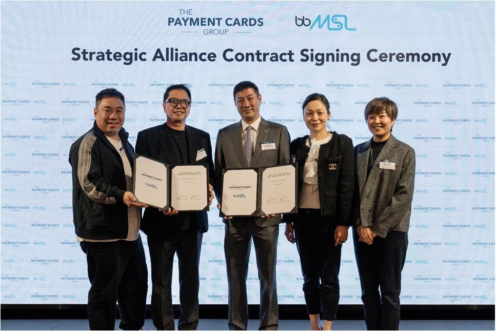 From left to right: AbbyPay representative Mr. Barry Mak, founder of The Payment Cards Group Limited Mr. Hu Jingbo, CEO of BBMSL Mr. Gerald Yu, CFO of BBMSL Ms. Zhou Aishi, and co-founder and COO of The Payment Cards Group Limited Ms. Beatrice Tai jointly presided over the signing ceremony.