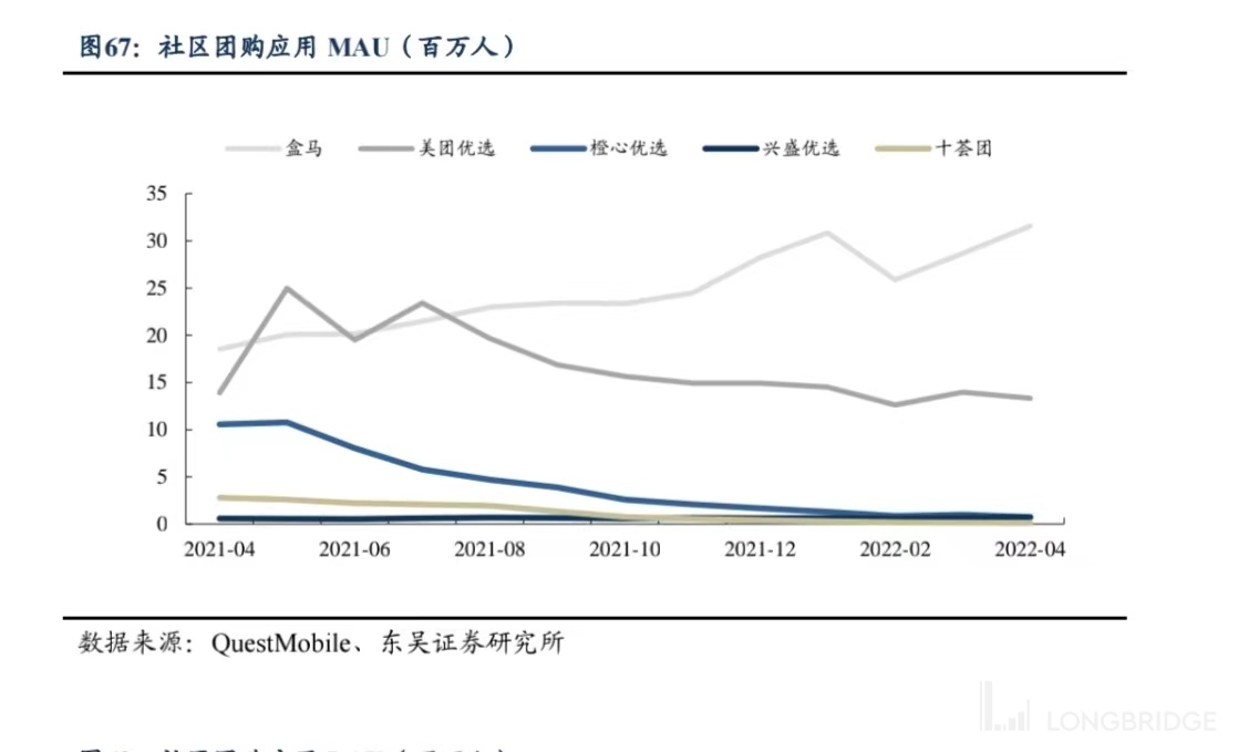 2022 年 4 月,社区团购两级分化严重,流量聚集效应明显。从用户规模来看盒马和兴盛优选 MAU 环比分别上涨 10.1%、9.4%,其他平台环比均有所下降;橙心优选转增为跌 4 月 MAU 环比下降 25.3%,十荟团仍未走出下跌阴霾 MAU 环比跌幅最大达 28.7%.DAU 来看盒马(淘菜菜)表现亮眼,以 27.2%的环比增幅远超其他应用。从使用时长角度来看,日均使用时长增幅最大的为兴盛优选,环比增加 18.1%;盒马紧随其后环比增长 15.9%.盒马(淘菜菜)优势不断扩展、与其他应用拉大差距,逐渐领跑社区团购应用。