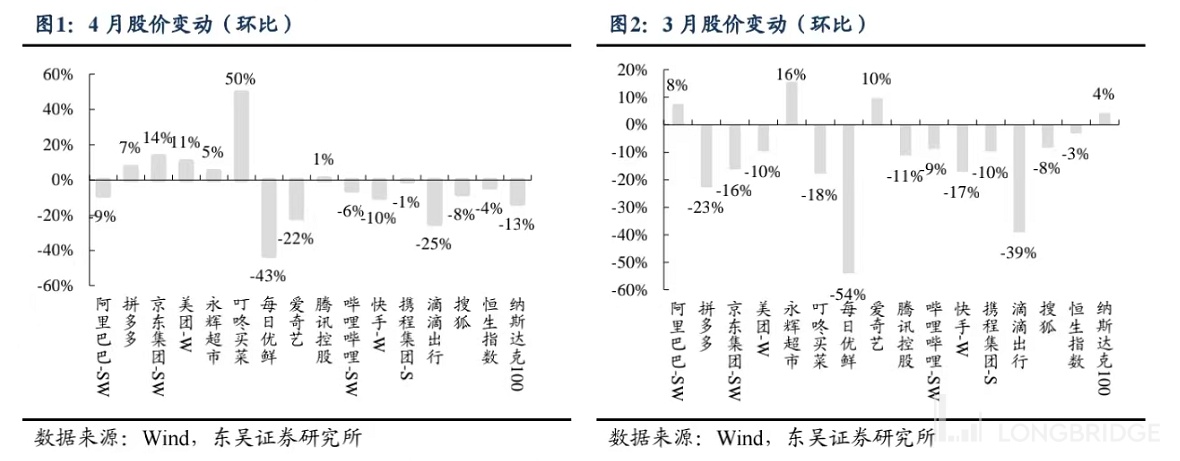 2022 年 4 月,国内宏观层面仍受疫情影响,整体线上线下销售已经处于复苏阶段,但短期消费仍有所承压。恒生指数环比下跌 4%,纳指下跌 13%,创下金融危机以来最差单月表现。$PDD(PDD.US) 拼多多和京东分别上涨 7%和 14%:仅阿里巴巴下跌 9%。生鲜电商叮咚买菜表现亮眼 4 月大涨 50%,一改 3 月颓势:而每日优鲜则持续走低跌幅达 43%;永辉超市股价上涨 5%相较 3 月增势放缓,多数公司跌幅收窄,哗哩哔、快手、携程、滴滴出行和搜狐 4 月分别下跌 6%、10%、1%,25%和 8%。长视频公司爱奇艺受下跌 22%;美团和腾讯迎来向好起势,4 月分别环比上涨 11%和 1%。