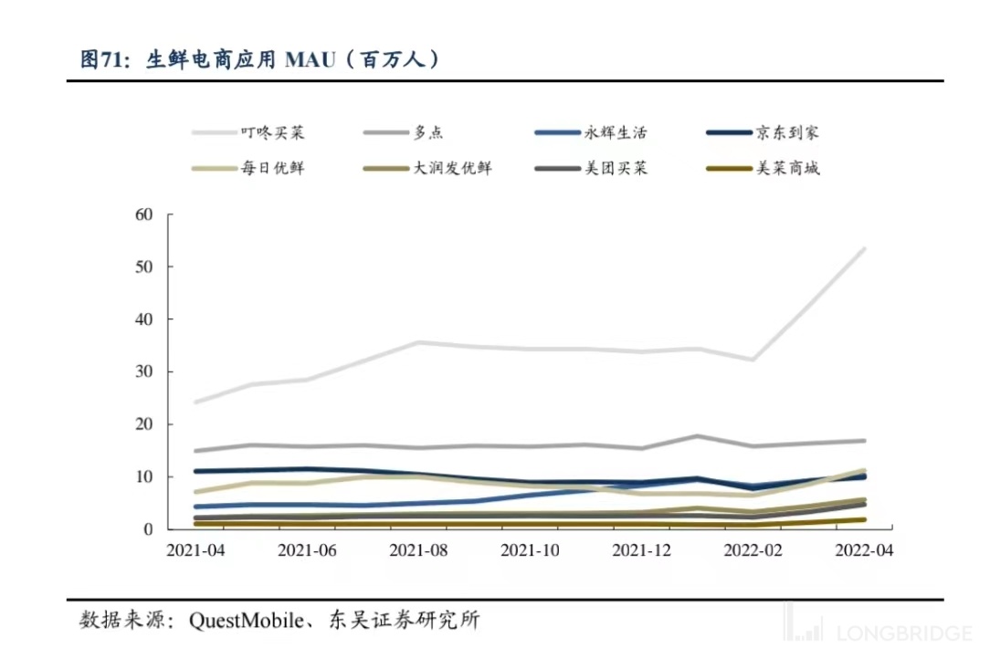 2022 年 4 月,生鲜电商无论用户规模还是使用时长均维持了大幅增长,用户规模方面,生鲜电商应用 MAU、DAU 相较上月均有不同幅度的增加,其中 MAU 环比增长幅度前三的分别为美团买菜,美菜商城、每日优鲜,环比增幅分别为 41.2%、38.7%,312%,DAU 环比增长幅度前三的分别为叮咚买菜,美团买莱、每日优鲜,环比增幅分别为 78.2%.76%、69.3%。