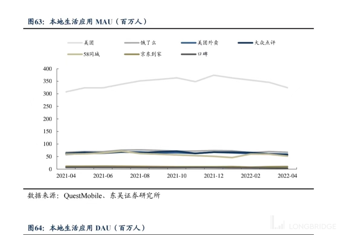 2022 年 4 月,大部分本地生活应用用户规模及使用时长均有所下降,活跃用户规模方面,MAU 环比除京东到家增长 7.4%外,其余平台用户规模均下降,降幅最大为口碑环比下降 15%:用户使用时长方面,日均使用时长均呈下降趋势,仅有美团和大众点评人均单日使用时长环比上涨 2.8%、0.9%。依旧受制于疫情影响,外出就餐娱乐减少,外卖跑腿业务均有受限。
