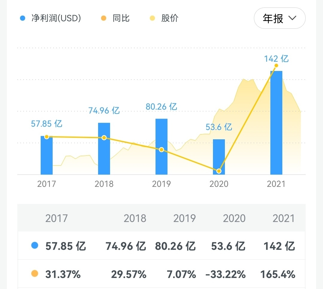 2021 年报数据显示,净利润在近 5 年首次突破 100 亿美元大关,录得 142 亿,同比增速更是高达 165.4%。