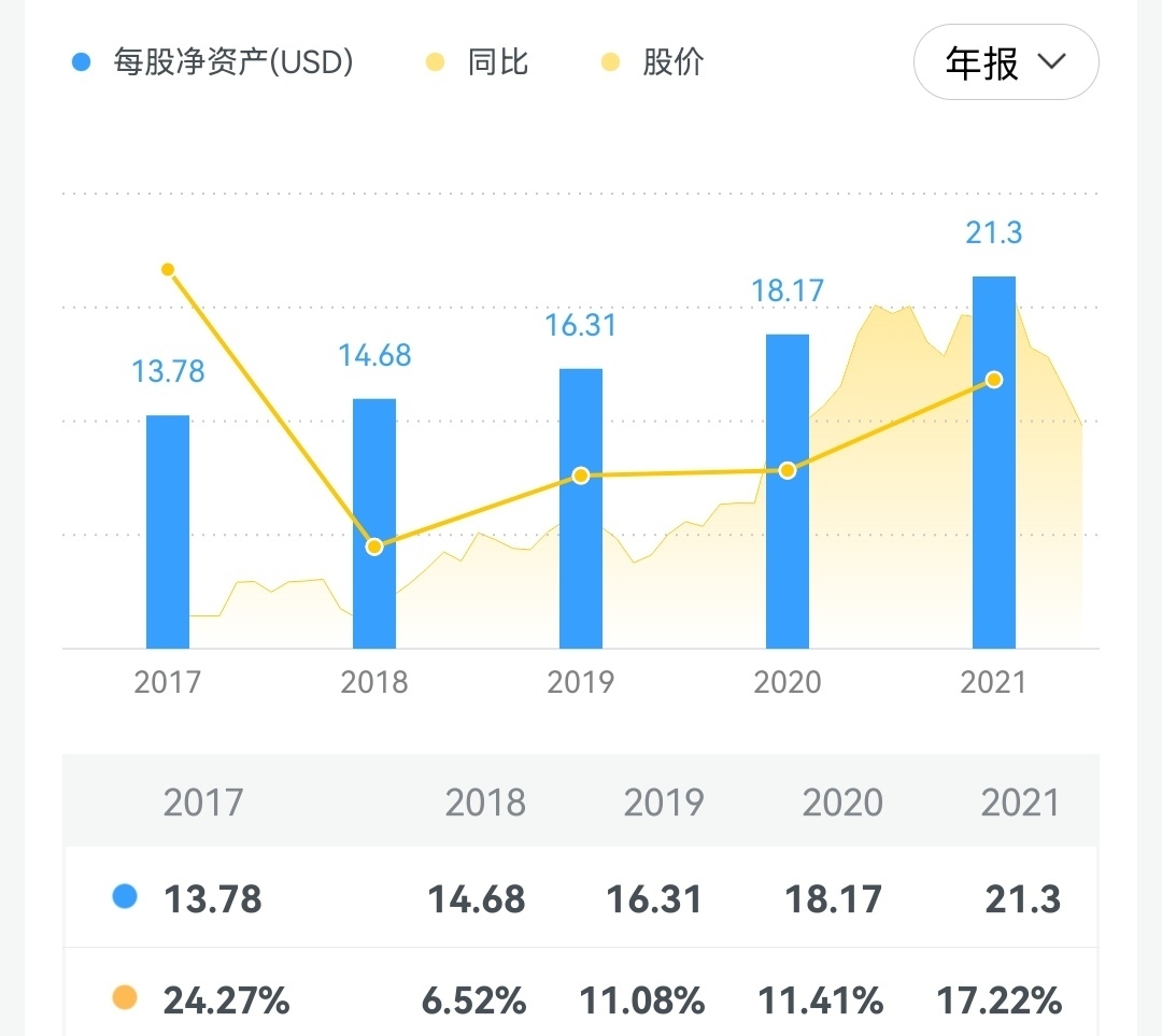 2021 年报数据显示,每股净资产在近 5 年首次突破 20 美元大关,录得 21.3 元,同比增长 17.22%。
