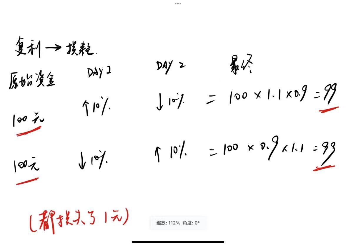 First, we need to understand that market gains are compounded. For example, if I have $100 and invest in a stock that rises 10% on the first day and falls 10% on the second day, the final result would be: Day 1: 100*1.1=110, Day 2: 110*0.9=99, resulting in a loss of $1.