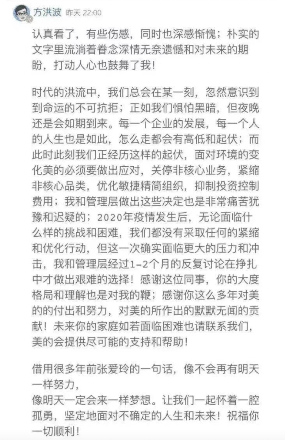 最近,一位美的的老员工在内网留言,并且被美的集团$Midea Group(000333.SZ) 董事长方洪波回复。