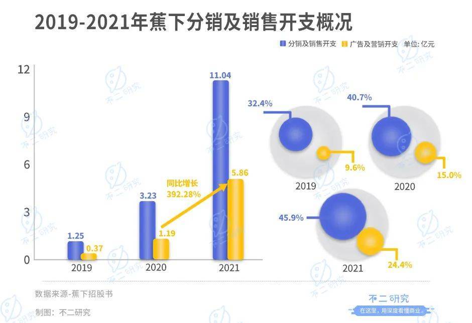 或由于此,伴随互联网获客成本不断增高,蕉下的的广告及营销开支也在不断增长:2019-2021 年分别为 0.37 亿、1.19 亿、5.86 亿,在同期营收占比 9.6%、15.0%、24.4%。仅在 2021 年,蕉下的广告及营销开支比去年暴增 392.28%。2019-2021 年,蕉下的分销及销售开支为 1.25 亿、3.23 亿、11.04 亿,同期营收占比分别为 32.4%、40.7% 及 45.9%