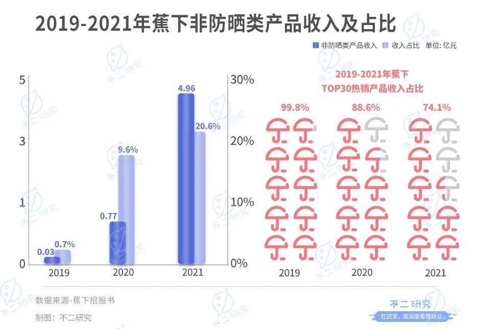 尽管其试图丰富营收来源,但主要收入依然依赖于部分网红商品。2019-2021 年,蕉下 TOP30 热销产品的收入,在当期营收占比分别为 99.8%、88.6%、74.1%。
