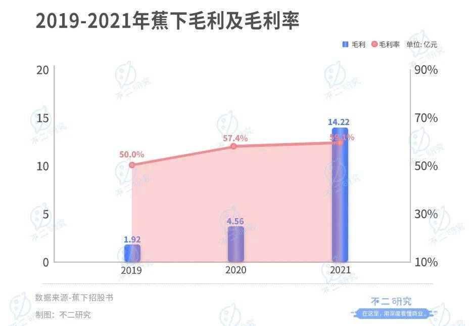 2019-2021 年,蕉下的营收为 3.85 亿、7.94 亿、24.07 亿元,2021 的年复合增长率达到 204%;同期,其毛利率也高达 50.0%、57.4%、59.1%,两年间提升了 9.1 个百分点。