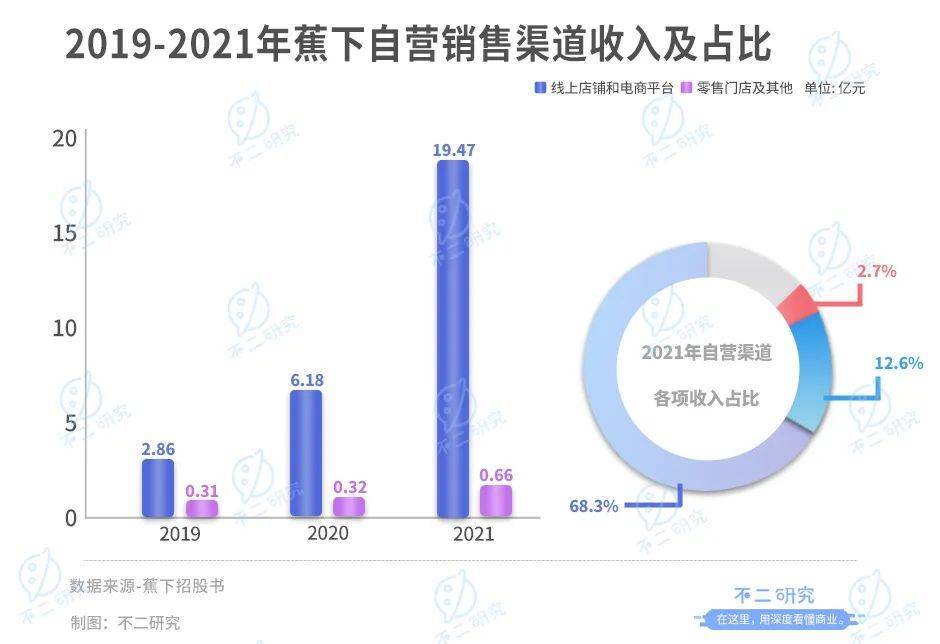 2019-2021 年,蕉下线上店铺和电商平台产生的收入分别为 2.86 亿、6.18 亿和 19.47 亿元;通过零售门店及其他 (主要包括向拥有成熟零售网络的大客户销售) 产生的收入则分别为 0.31 亿、0.32 亿和 0.66 亿元。