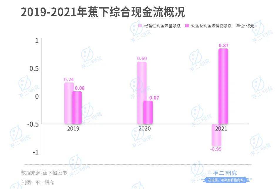 此外,蕉下在 2019-2021 年的经营性现金流量净额分别为 2410.9 万、6022.3 万、-9501.9 万元,已经出现经营性现金流出的现象。