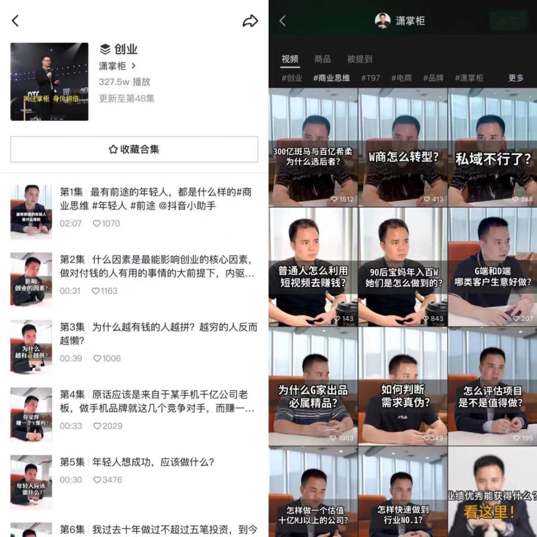 潇掌柜抖音视频列表(左)、视频号首页(右)