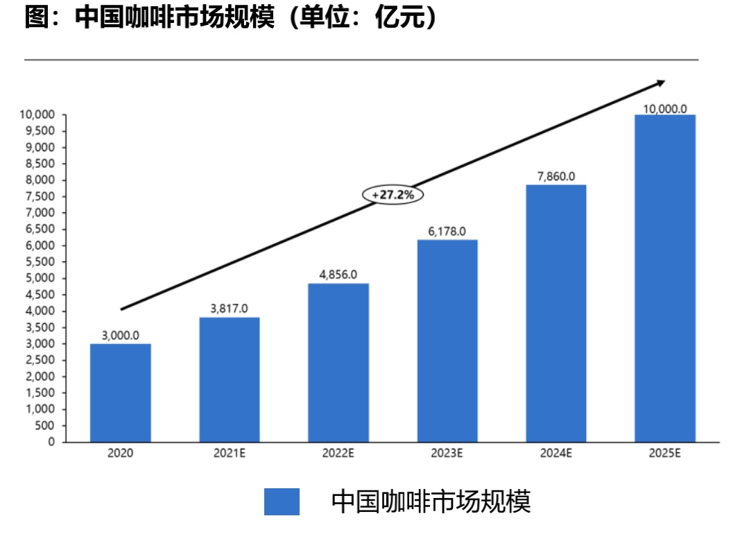 毋庸置疑,咖啡是个大品类。根据弗若斯特沙利文数据,2022 年中国咖啡市场规模将达 4856 亿元,2020-2025 年将以 27% 的平均复合增长率增长,预计 2025 年超过 10,000 亿元。