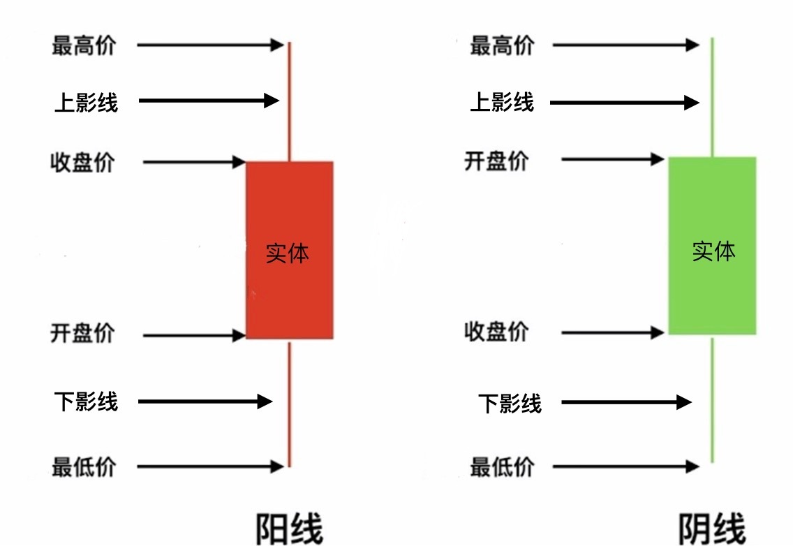 Real body: Formed by the opening and closing prices, indicating price movements. A bullish candle (closing price higher than opening price) is typically green in U.S. stocks but red in A-shares; a bearish candle (closing price lower than opening price) is usually red in U.S. stocks but green in A-shares.