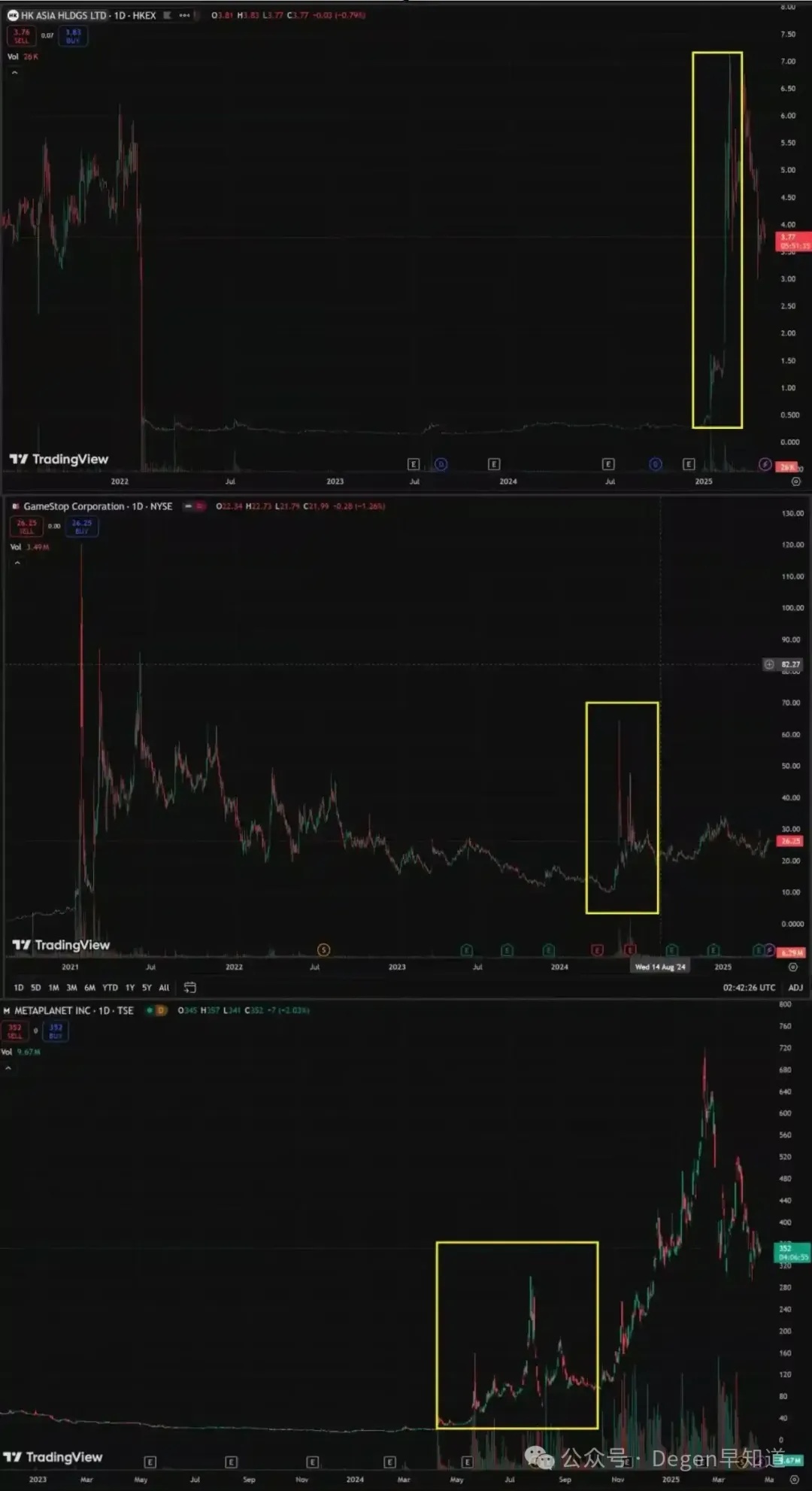 GameStop 这家因 2021 年「散户大战」名噪一时的零售商,在 2025 年 3 月 27 日宣布发行 13 亿美元零息可转债购入比特币前,股价因相关传闻在盘前上涨超 18%。日本的 Metaplanet 也是不遑多让,2024 年 4 月效仿微策略购入比特币以来,股价飙升约 4000%,2025 年目标直指 1 万枚比特币。