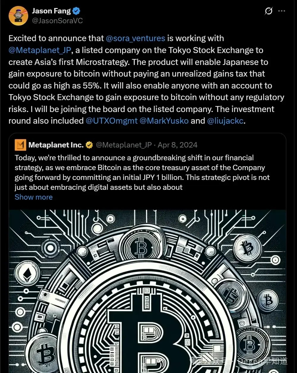2024 年 4 月,Sora Ventures 的创始人 Jason Fang 在个人推特账号上写道:Metaplanet 是「亚洲第一个微策略」,并通过与 UTXO Management、Mark Yusko 等的合作,帮助 Metaplanet 将比特币纳入资产负债表,成为日本首家公开持币的上市公司。