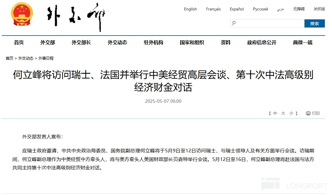 After hours, at 5:55 Beijing time, a Foreign Ministry spokesperson announced: At the invitation of the Swiss government, He Lifeng, member of the Political Bureau of the CPC Central Committee and Vice Premier of the State Council, will visit Switzerland from May 9 to 12 to hold talks with Swiss leaders and relevant parties. During his visit, Vice Premier He Lifeng, as China's lead on Sino-US economic and trade issues, will hold talks with US Treasury Secretary Janet Yellen. From May 12 to 16, Vice Premier He Lifeng will visit France to co-chair the 10th China-France High-Level Economic and Financial Dialogue.