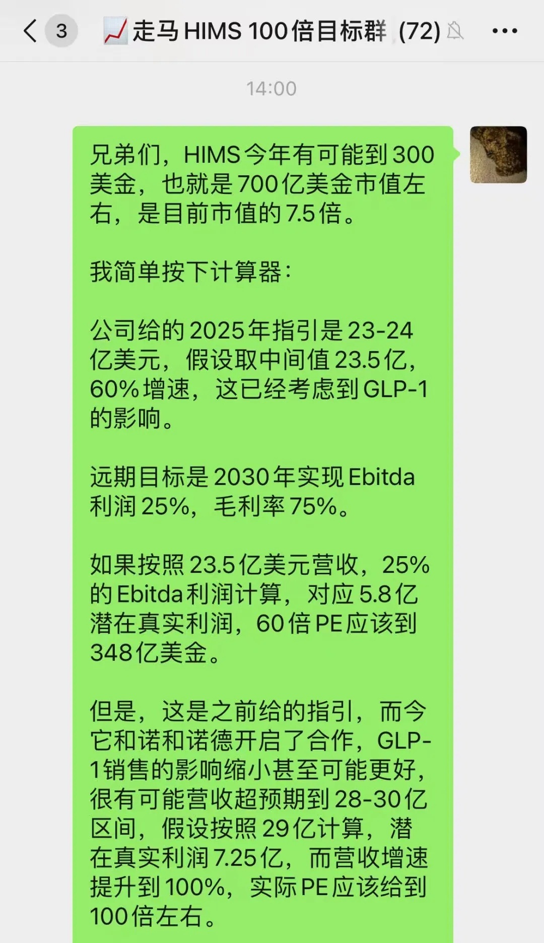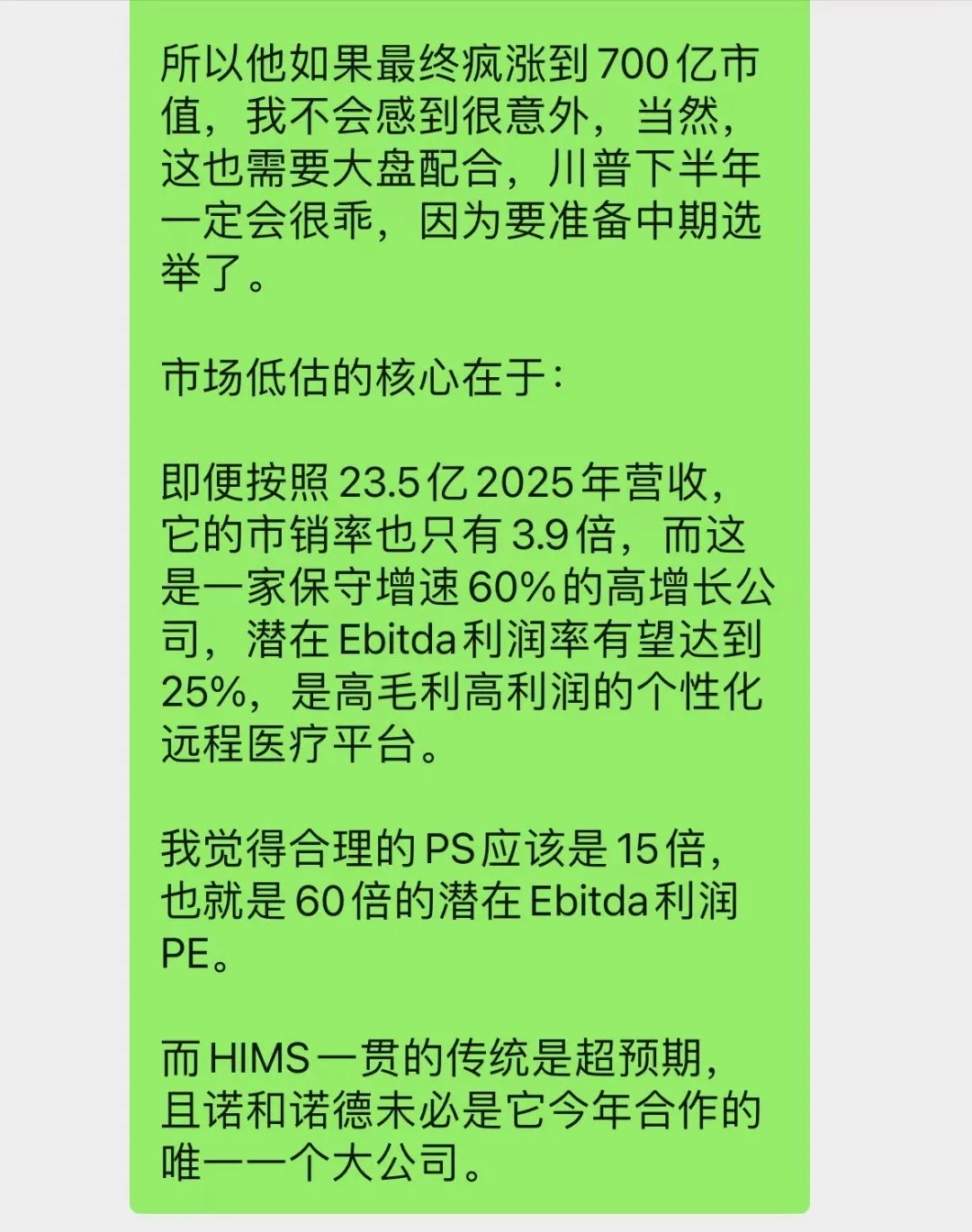 Currently, Hims trades at $40/share ($9.1 billion market cap), with a 2025 P/S of just 3.9x. A 25% EBITDA margin implies a forward P/E of only 15.5x—unjustifiably low for a company growing at 60% (likely faster). A 15x P/S (60x implied P/E) is more reasonable here.